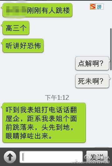 第 第六感 初中二年级 注册 2009-02-10 消息 481 反馈评分 0 点数 0 2012-08-07 #1 今天从微博得知一跳楼自杀事件,未经证实,大家先看看传闻吧 今天**中学发生了一名高三学生跳楼 的惨剧,他死前在腾讯微博发了一条说说 ,说学校的领导侮辱他,嘲笑他,想让他退 学,他要以死做鬼去找他们!一条十八岁 的青葱生命就此离去!究竟是怎么一回事 ,让一个孩子选择了死亡!还公道,求真相 [attachmentid=298787] [attachmentid=298786] 附件 手机_副本.jpg 51.9 KB · 查看: 498 951a8bc6gw1dvo5mfrincj_副本_副本.jpg 62.5 KB · 查看: 459
