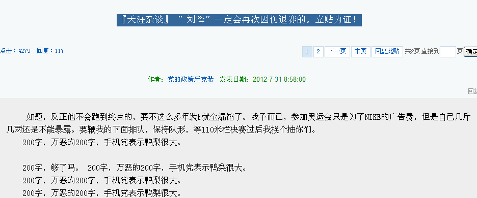 爱 爱你九九 初中一年级 注册 2012-07-02 消息 400 反馈评分 0 点数 0 2012-08-07 #38 刘翔是正常发挥好不、、、、、、、、、、、、、、、、、、、、、意料中。他输不起啊。只能这样啊。。。。。。。。。。。。。。。。。。