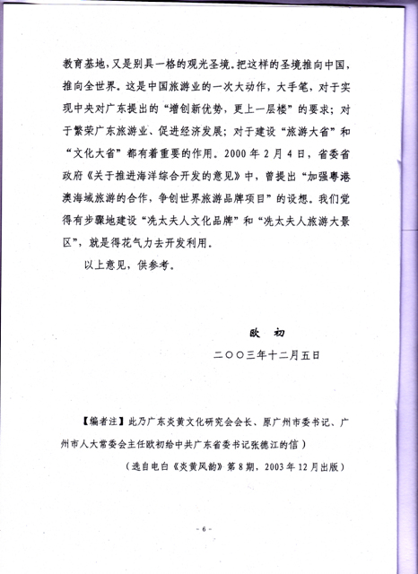 广东炎黄文化研究会会长、原广州市委书记、广州市人大常委会主任欧初,在2003年12月5日写给时任广东省委书记的张德江同志的信。