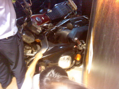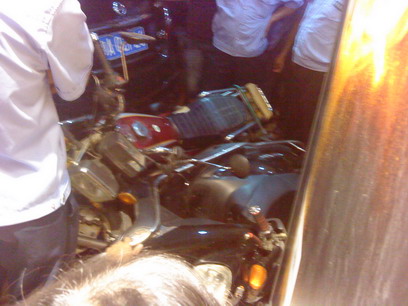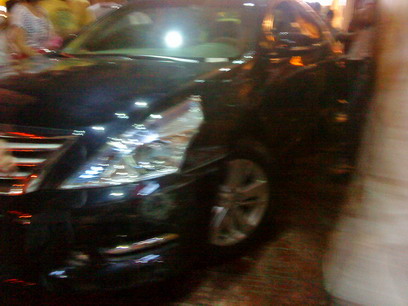 今晚大概八点几钟在水东湾大酒店对下,水东安踏体育专卖店门口.一辆粤A牌凯美瑞小轿车疑"也算听闻"快速倒车车尾撞到安踏体育专卖店门囗,只见有两辆摩托被撞倒,其中一辆压住一位不知是路人或驾驶者?随后巡交警到现场,120救护车也到位,看情形不是很严重