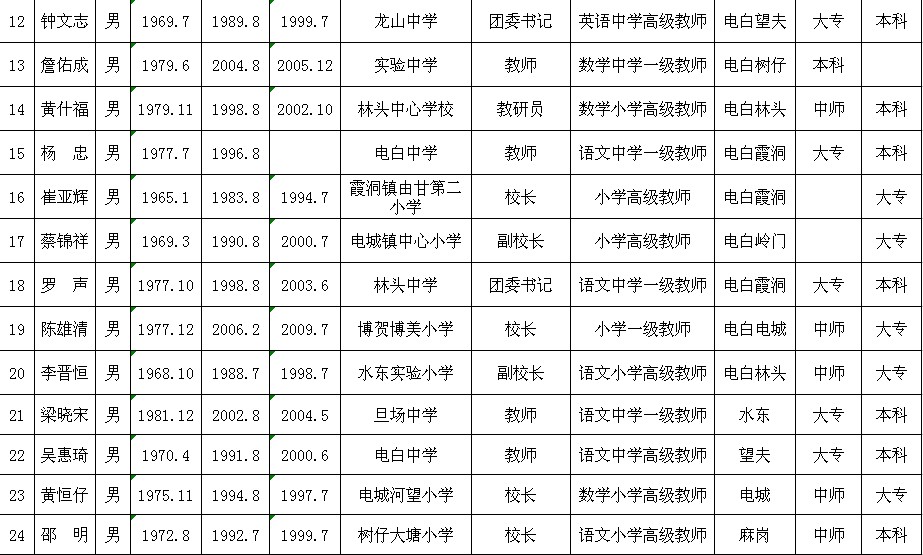 17 蔡锦祥 男 1969.3 1990.8 2000.7 电城镇中心小学 副校长 小学高级教师 "电白