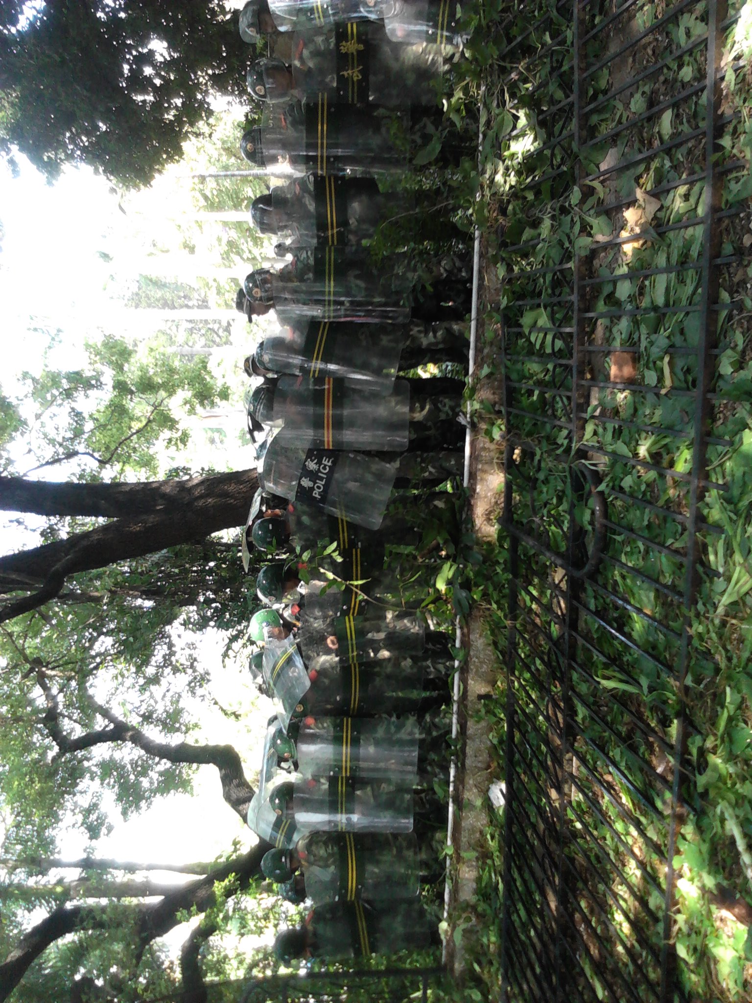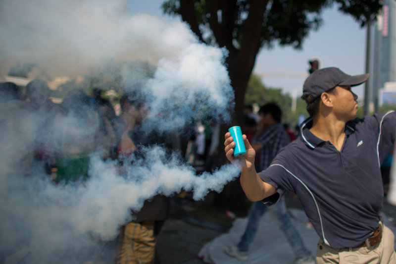 9月16日一大早,深圳华强北和各个地点开始有游行队伍出来,开始都是一小队的游行和叫口号,政府早已经在各个位置布置了大量的军警,因为这次游行政府是不批准的,军警一见到有人集合,就会上前驱散队伍,抢夺人们的标语横幅。直到十点钟过后,人群越来越多,看到大家都是走路过来的,因为当时公车和地铁的站点不准在游行的地方靠站。小队伍游行的人已经很多了,大家都在大道上走来走去的,军警故意用人墙分隔开人们集合,还抓了一些示威群众,天上有直升机在飞来飞去。造成有群众在市委门口要求放人,人群聚集的已经很壮大了,大家在政府门口抗议,要没条件放人。最后跟门口的军警发生冲夺,人们在扔东西还击,军警放崔泪弹到人群中来,被人扔了回去。人没有放,最后可以游行了,众多的群众组成队伍还游到罗湖口岸去。