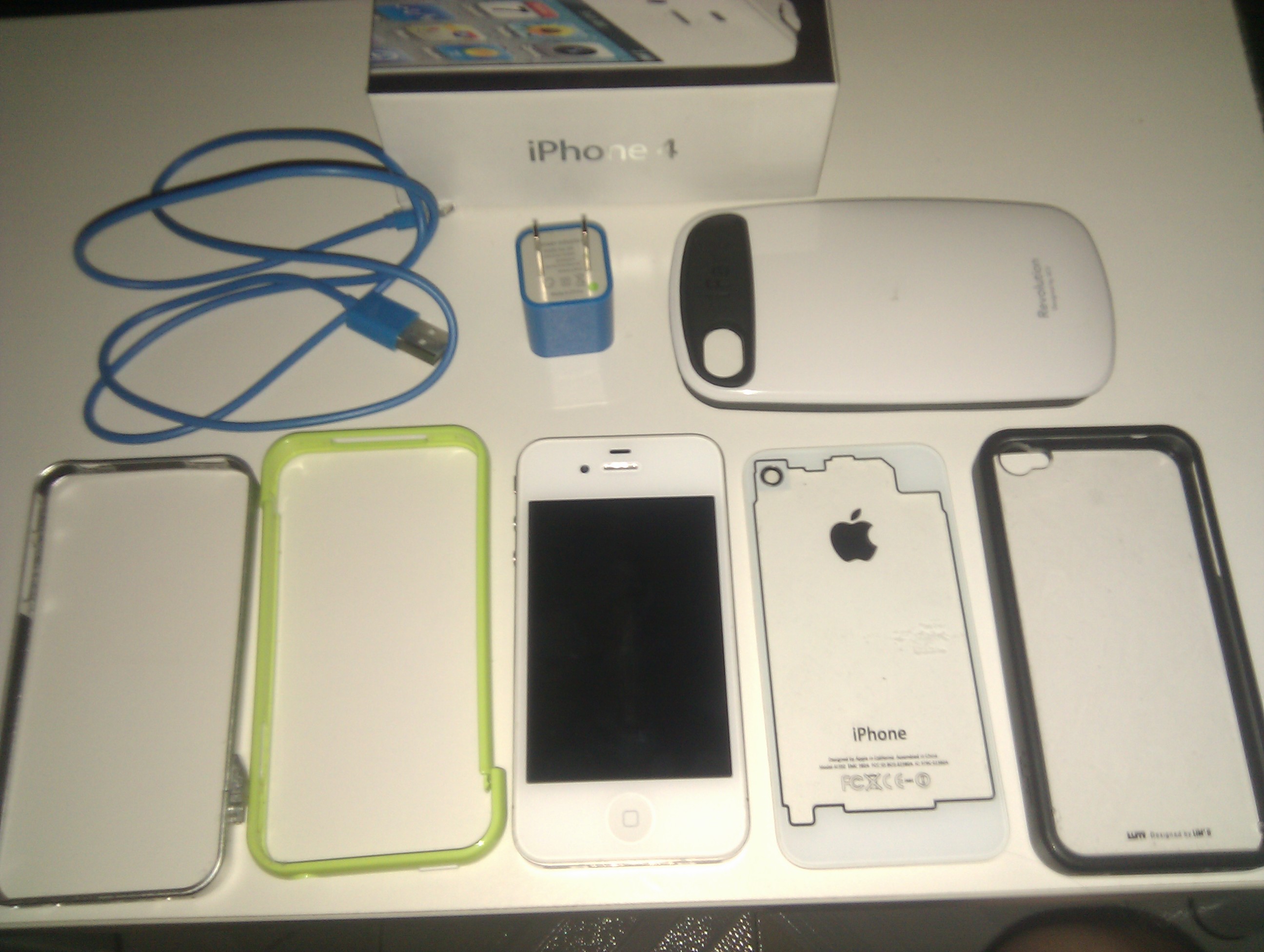 加拿大版iphone 4 白色 16G、(有锁)。5.0.1。完美越狱~~。二码合一。冷屏~自用半年~系列号可查~无修,无进水。~ 拆下来换过透明的后盖。单纯的就只是换后盖。~可拆开看验货。~功能一切正常。带卡贴。。成色9新左右。至于配件,。。除了买行货或正港行。其余的基本都是高仿货吧。所以我的也算是吧。原配来的耳机跟充电器数据线。都扔了。蓝色那套是另外买的。耳机买了入耳式的苹果那种。~还没到(到了配一起)。带4个壳+一透明后盖。~~ 再三强调。机器一切正常。WIFI。SIM卡信号~完美。 现对换IPad 2 16G WIFI 版。白色。完美越狱。机况跟我的差不多。~有意~水东本地试机。~ 联系马化腾:81177153~