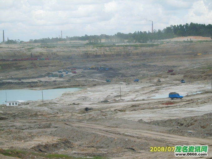 茂名因它而建市的矿――露天矿,这里的矿石叫:油母页岩,是可以提炼出石油的一种矿石。这里因开采油母页岩而形成一大矿坑。这地方灰尘很大 所以我穿了一身的黑衣服 如果穿的是白衣服 一圈下来一定会变成黑衣服。看看坑里面全都是粉尘,只开发而不治理的矿坑,我甚至怀疑这湖水里是否已有被幅射改变形状的怪兽。为了那点石油 为 了钱 ,人们拼命的掠夺式开采,终于N年以后,这美丽的地方再也无人想居住。