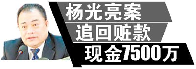 2010年9月2日,省纪委通报称,茂名市委原常委、原常务副市长杨光亮涉嫌收受贿赂、收取“红包礼金”、放高利贷等多种违纪违法活动,其家庭存款约6500万元及多处房产,债券、基金、股票1300多万元。现已追回赃款现金7500万元,债券房产等全部冻结。打开杨光亮的“两箱一盒”后,身经百战的办案人员都大吃一惊!其中仅存折就达60多本,每笔存款几乎都达百万元之巨,共计人民币6000余万元。