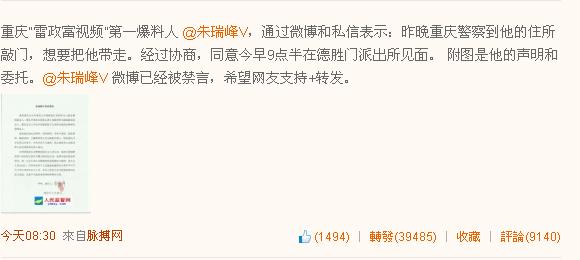 @李开复微博;重庆“雷政富视频”第一爆料人 朱瑞峰惹麻烦了。