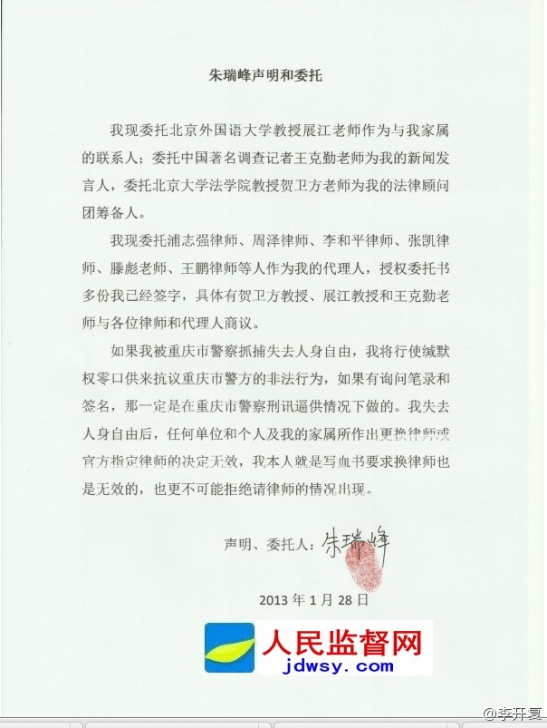 张凯律师在新浪微博说 :已到朱瑞峰家,陪他一起去派出所。而不少网友对此消息表示兴奋,认为这下热闹了!