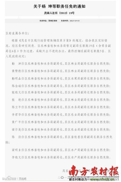 茂南区人力资源和社会保障局有关工作人员也向记者证实了该区农林畜牧和水务局所经历的人事变动和发布过的通知,去年该区实施大部制改革,这是落实《茂名市区级行政管理体制改革方案》的需要。