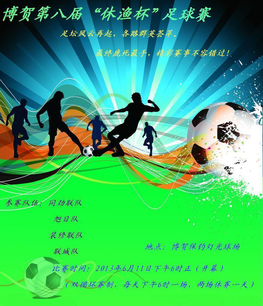 博 博贺水手 学前班 注册 2007-03-17 消息 49 反馈评分 0 点数 0 2013-06-09 #1 博贺第八届“休渔杯”足球赛,将于2013年6月11日起,在博贺保钓灯光球场举行,欢迎各路足球爱好者莅临指导交流。。。。 附件 海报.jpg 155.6 KB · 查看: 1,086