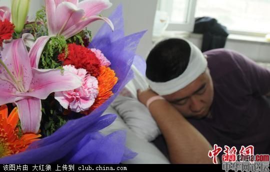 被打民警任杰躺在病床上,头部伤口缝合了五针.jpg