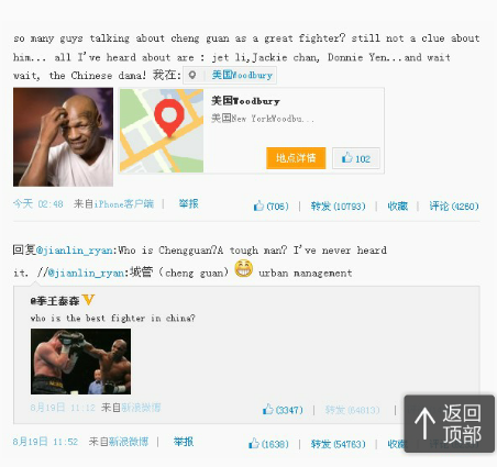 拳王迈克・泰森8月19日在其官方微博发问“Who is the best fighter in china? ”(中国最好的拳击手是谁?),引来数万名网友踊跃回复。
