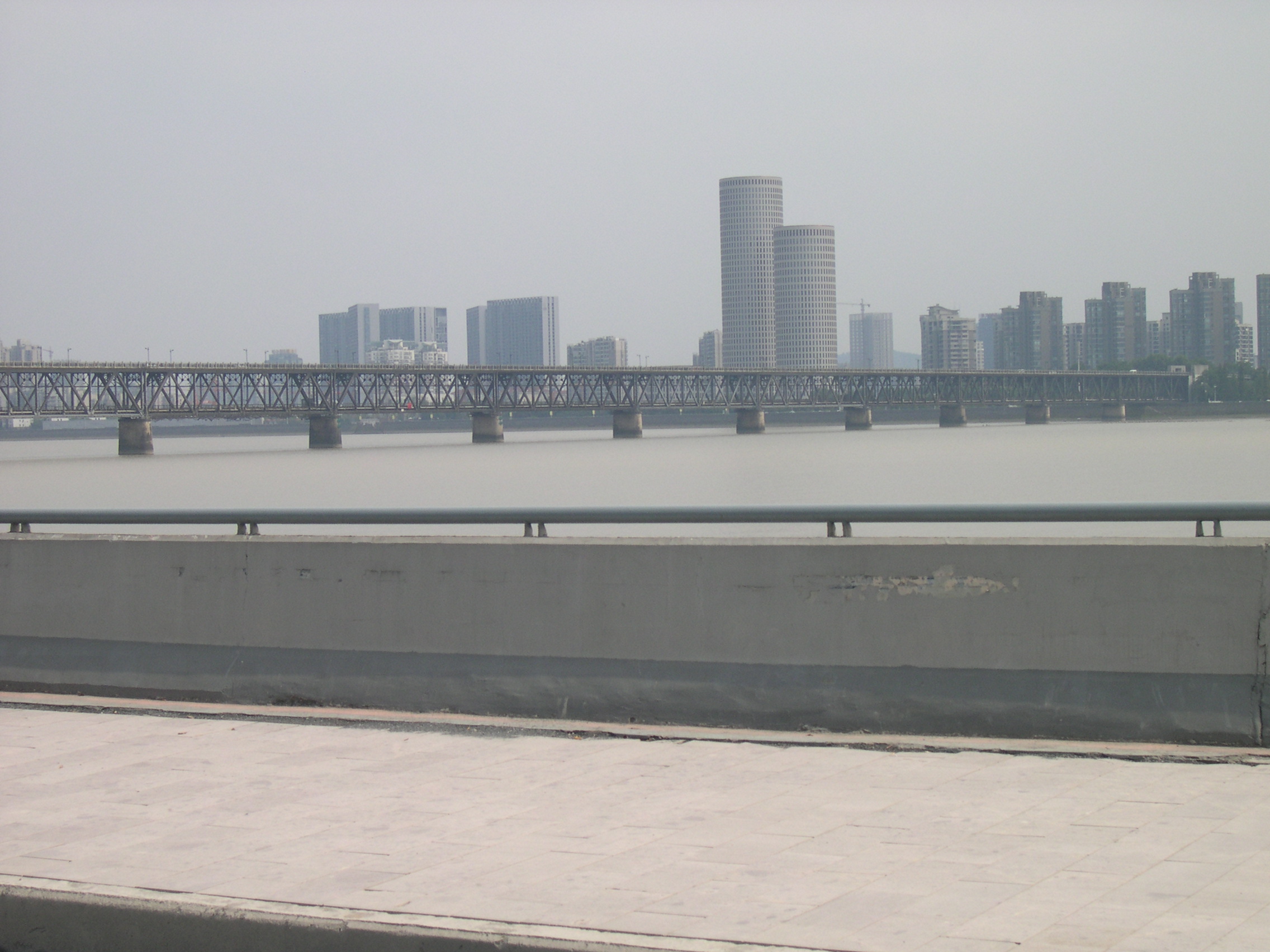 远处的钱塘江大桥 。去海宁盐官观潮的途中在车上拍的