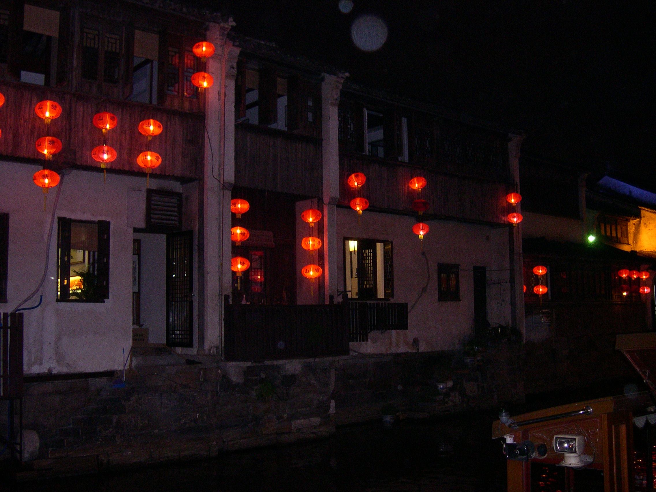 夜晚乘船游古运河,沿岸绚丽的灯光倒映在荡漾的水波里,摇曳的柳枝上:沿岸的灯光与苏州的古城建筑相得益彰,浑然一体,令人陶醉,沿途经过盘门、胥门、金门、闾门等10座苏州古城门和20座风格不一的桥梁。图为苏州运河边上茶室。