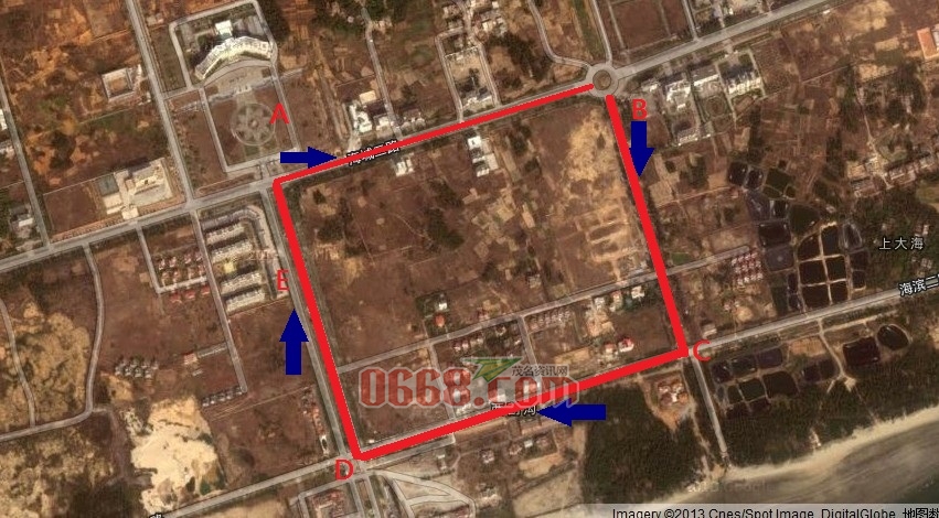 A点为茂港区区府门口,A点为出发点,蓝色箭头方向为骑行方向,B点到C点路段为沙石路,A点到B点,C点到D点,D点到A点为水泥路,E点为冲刺点。