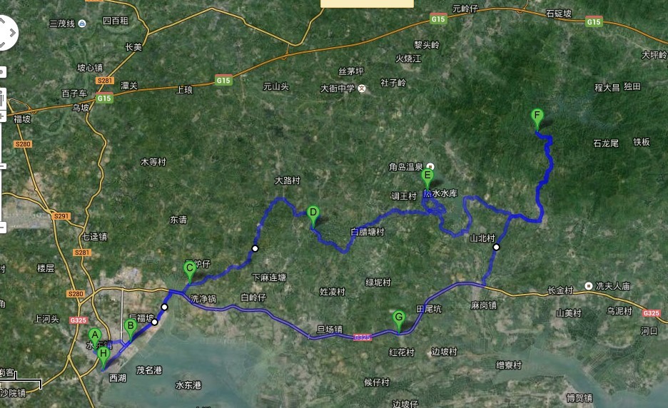 行程首先从水东经蓝田坡到河湾水库(地图D点),接着骑热水水库(地图E点),然后到达旱平水库(地图F点),返程经908乡道出325国道返回水东,全程约85公里。此次线路为探索线路,路况未明,请有心骑友做足线路攻略。当天活动暂不安排吃中餐,请参加活动的骑友备足饮用水与干粮(建议带压缩饼干及水东粽子),晚饭将视情况在麻岗就餐或自行解决,如发生就餐的费用当场AA,一般约30元/人。