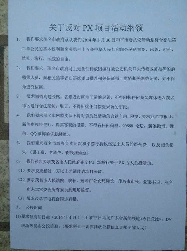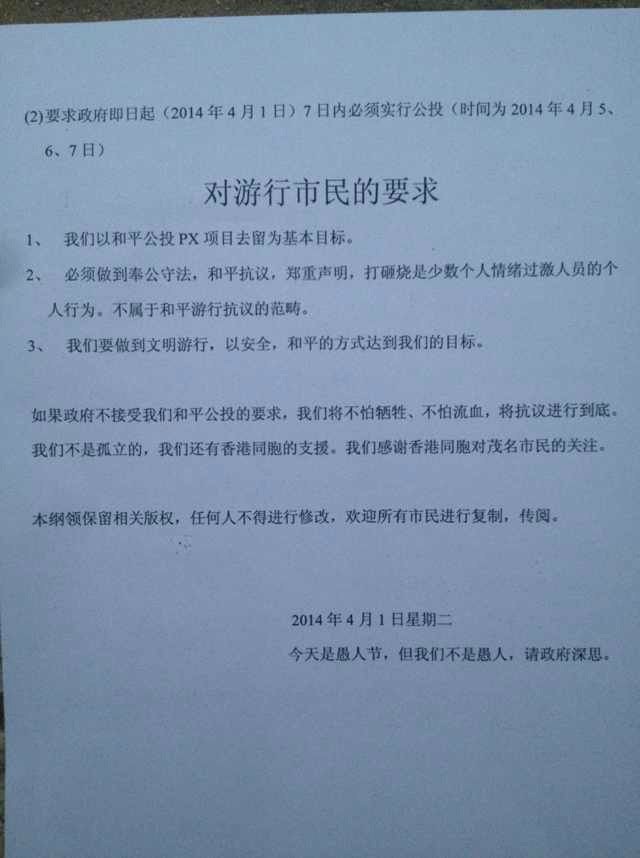 QUOTE(游客 @ 游客,游客,游客,游客,游客,2014年04月02日 Wednesday, 11:08 PM) qq空间流传甚广的一份市民声明 [attachmentid=324951] [attachmentid=324952] [snapback]3627847[/snapback] 很有水平。顶 不知茂名政府对此公告作何回应? 希望4月4号的对话双方能更文明,和平,和高效。