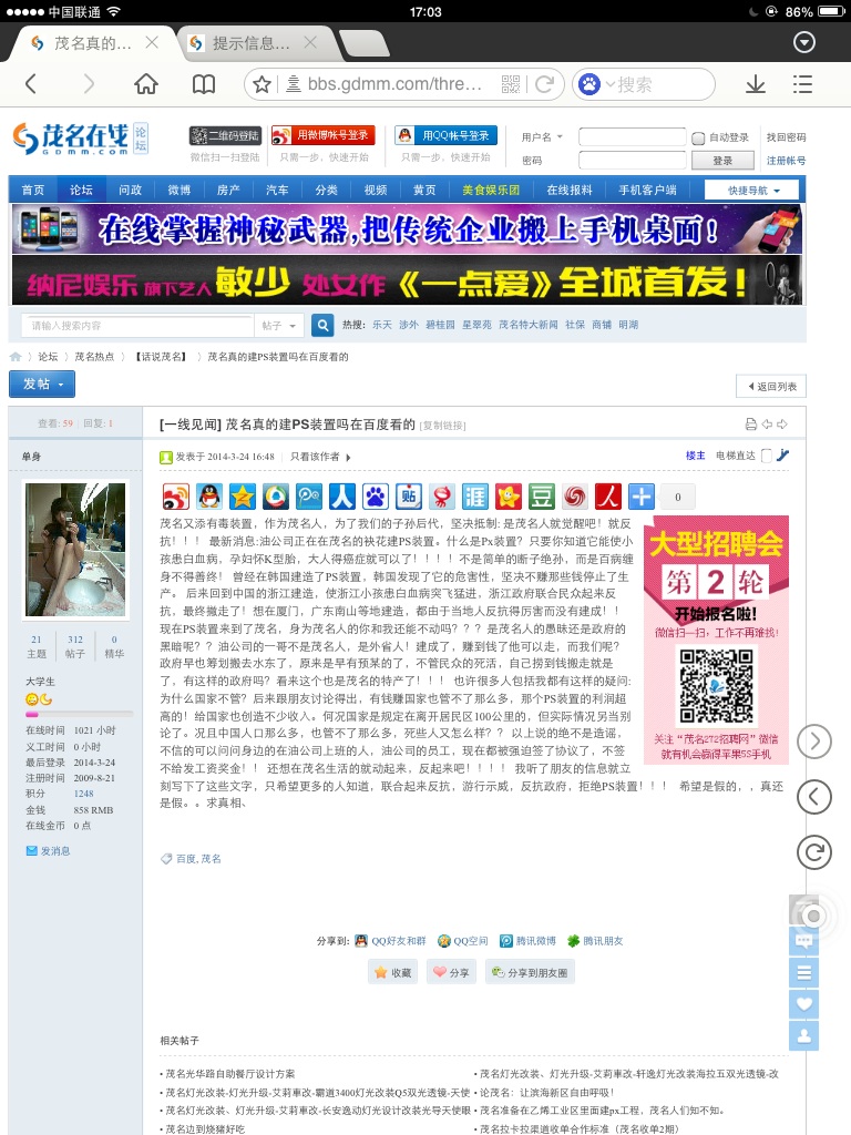 刚看到茂名论坛的一张贴,估计不超出五分钟就被删除,借这里特别说明,我们不鼓动大家上街散步,该网友故意写错一个字,避免被删: