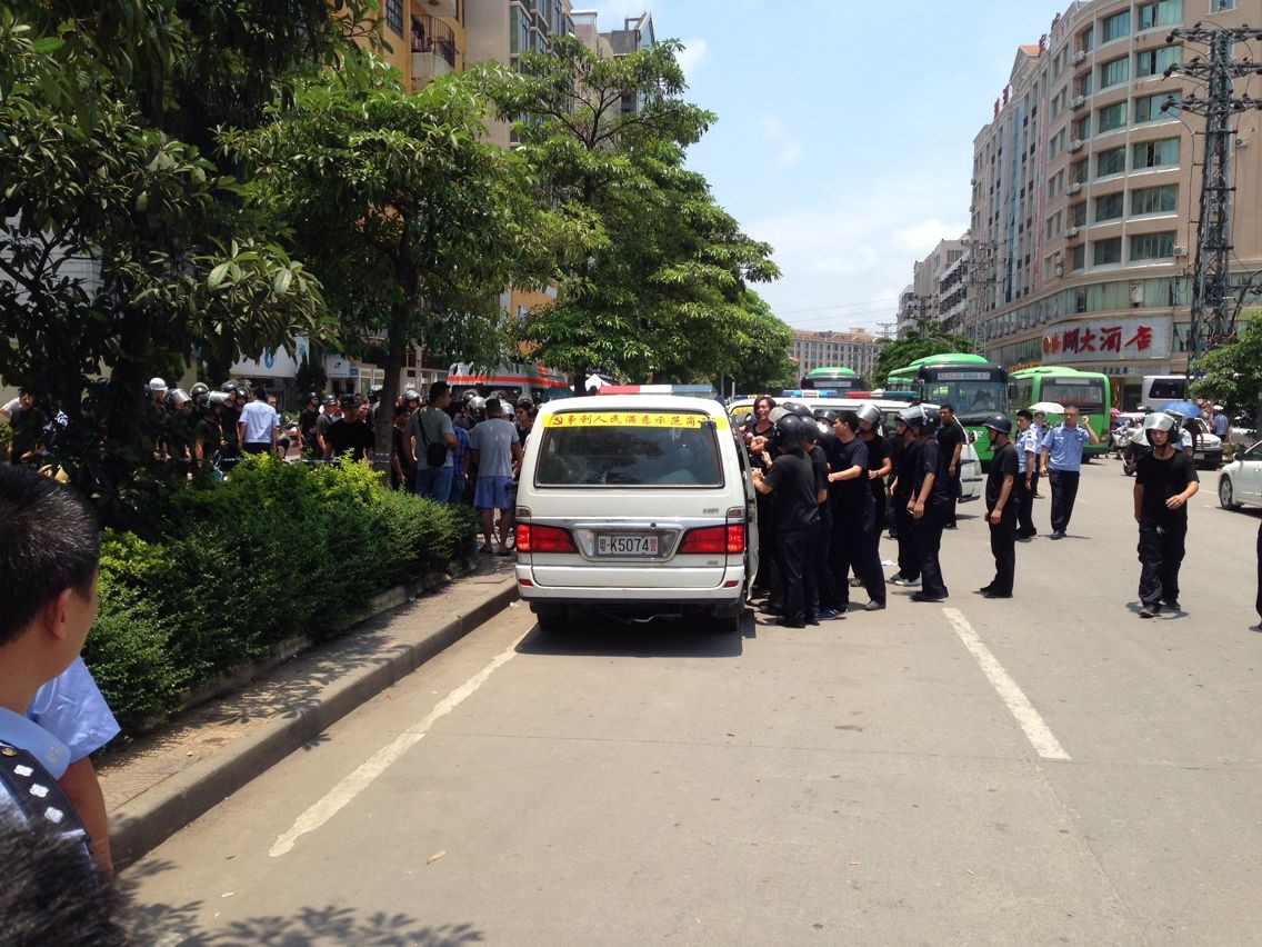 刚刚经过新湖路电白妇幼保健院,看到门口拉起白底黑字横幅,估计有超过一百名警察,几辆警车,旁边很多围观群众,走进一看,原来是家属闹事,没过一会,就看到一大群警察簇拥着,几个人就抬一个人上警车,目睹了至少三个被抬进警车,听说好像是剖腹产死人了。