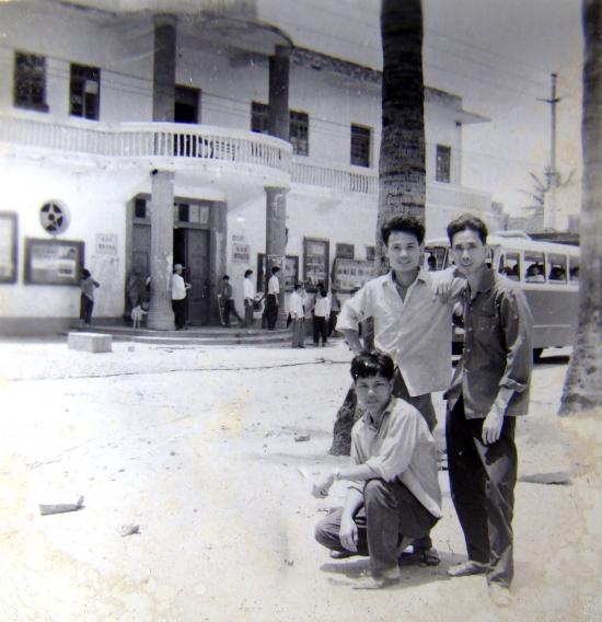 图片中三人合照左后立者叫郑明,前蹲者叫杨明,两人尚健在,右后立者倒也认识只是忘记姓名了.图片中文化宫门前一过往客车, 60年代至70年代博贺无客车站,往返上落均在与文化宫同一街道不远(相距50米左右)原人民旅行社门口,售票处设在原人民旅行社门口大堂,每天往返水东两班车.