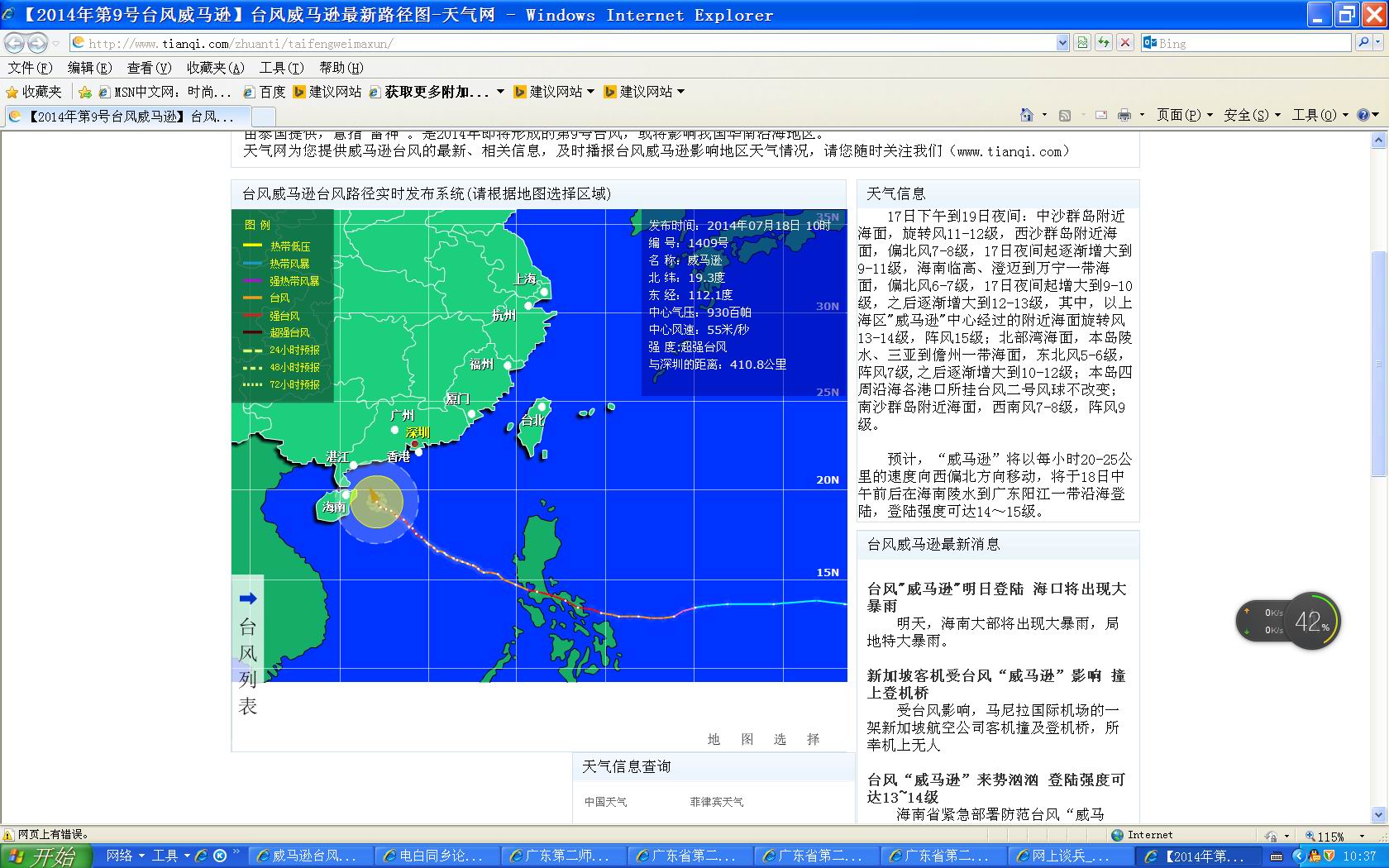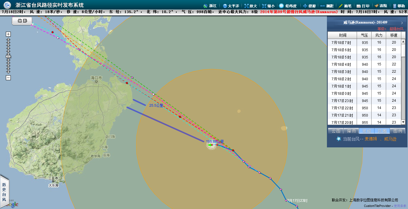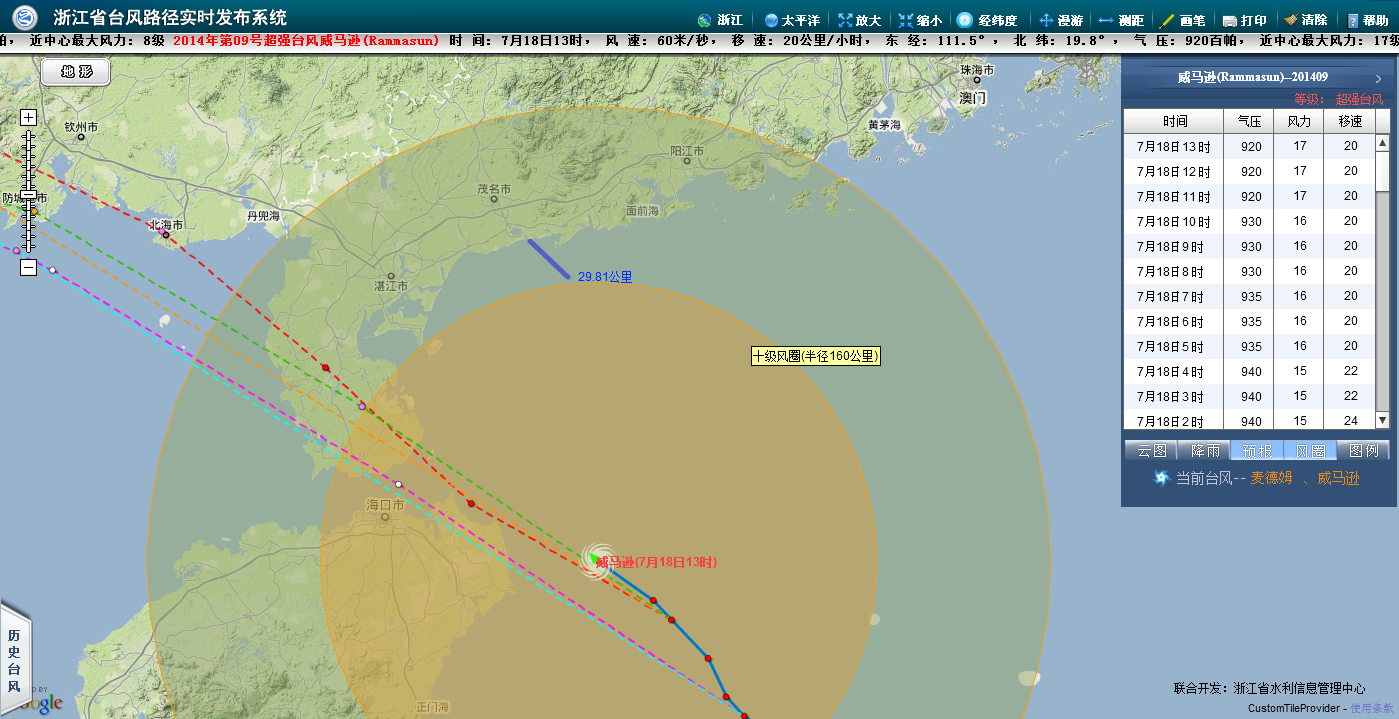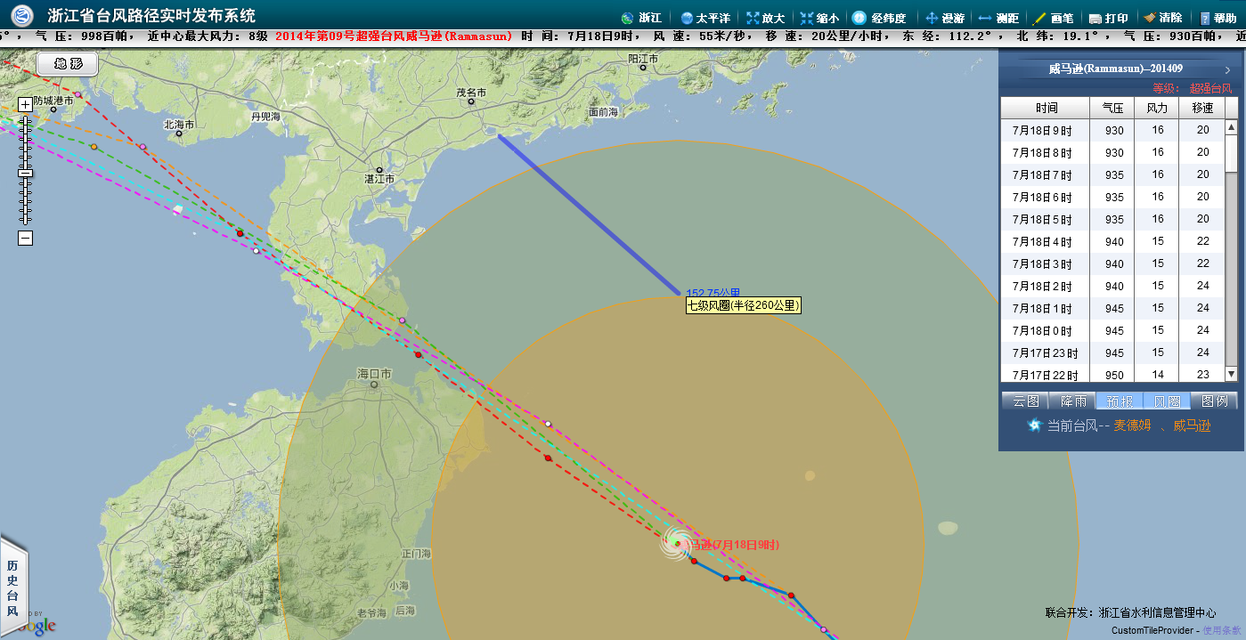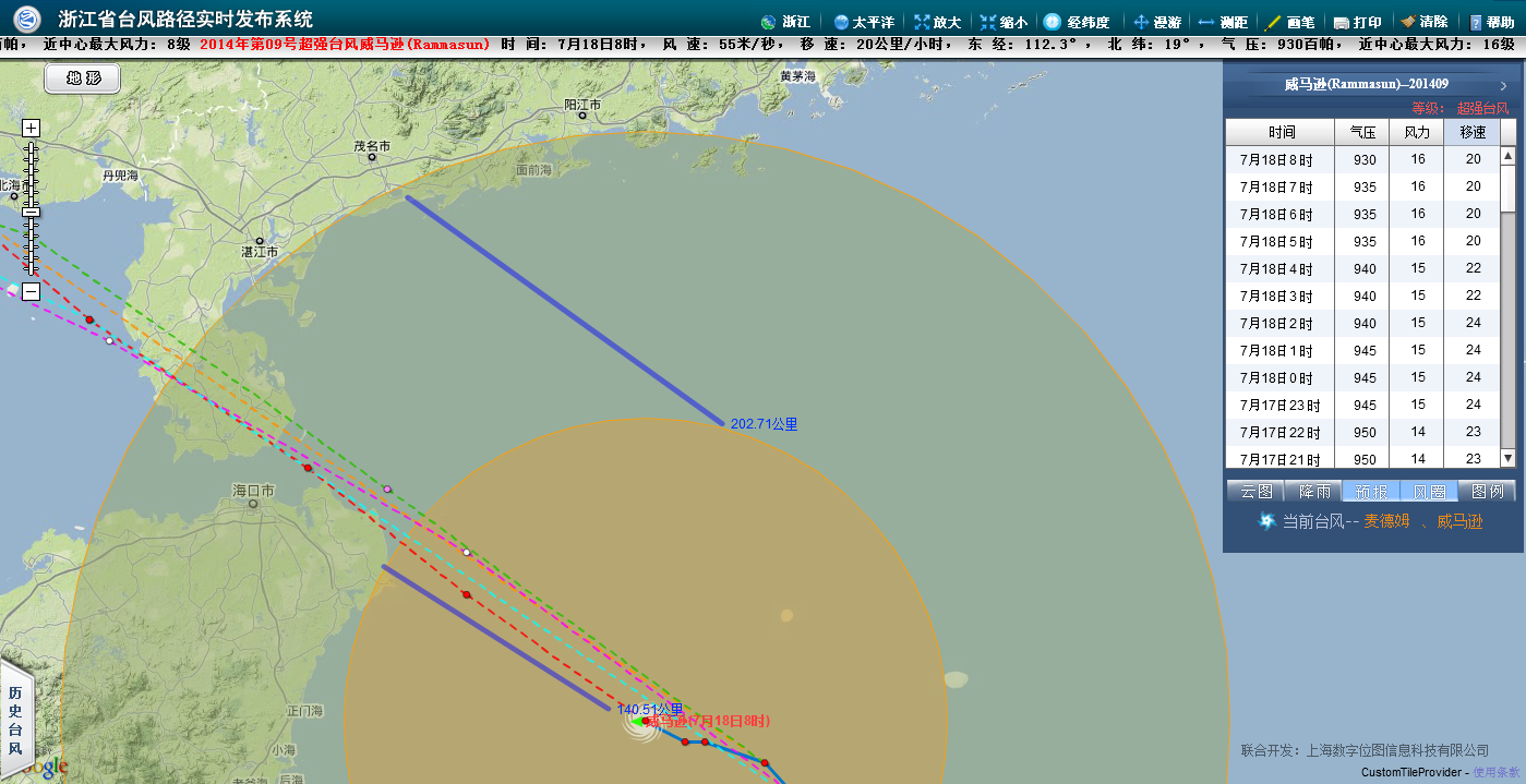 今年第9号台风“威马逊”于今天早晨5点钟加强为超强台风级,早晨5点钟其中心位于海南省文昌市东偏南方大约235公里的南海中部海面上,就是北纬18.8度、东经112.9度,中心附近最大风力有16级(52米/秒),中心最低气压为935百帕。