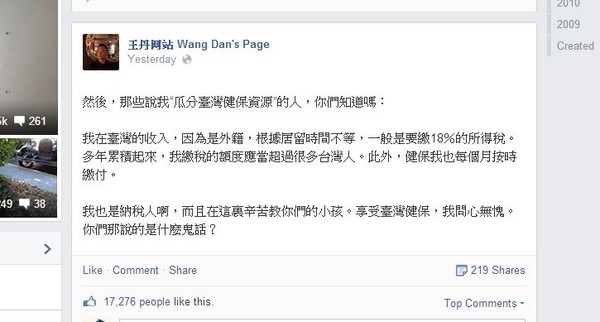 於W友的反浪,王丹反g道,他在任教於清A大W,寒暑假以外的rg都常住台常每年要按照外籍人士的世U18%的所得,健保M也牟辉少U,「多年累e起恚U~度超^很多台橙耍享受台辰”#我心o愧。」