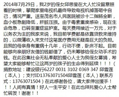 QUOTE(byronroy @ 2014年08月02日 Saturday, 01:01 AM) 支持 谁在茂名去看看 [snapback]3680728[/snapback] 希望有茂名工作的朋友核实下,也希望有心人能伸出援手
