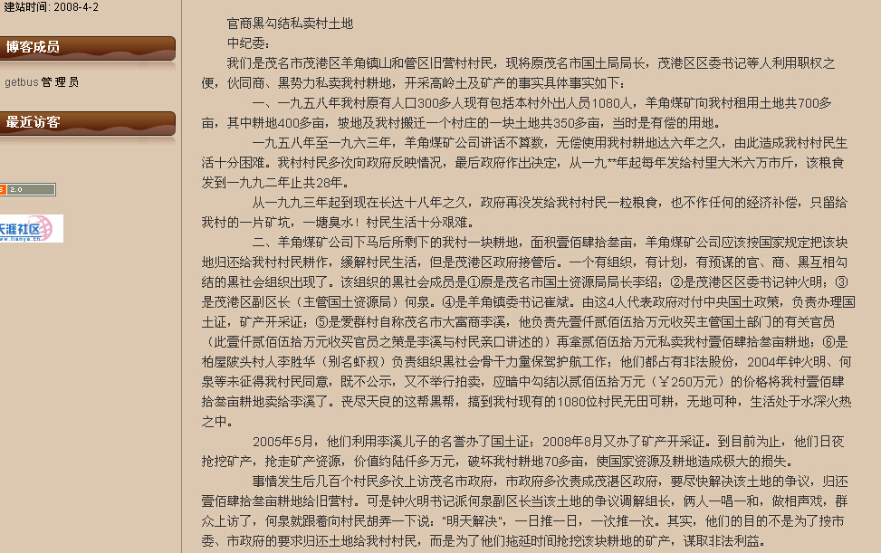 茂名市政府无视村民投诉 包庇下属官员 茂港区区委书记钟火明私下卖地“黑交易”