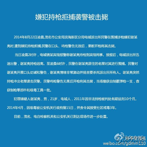 2014年8月22日凌晨,茂名市公安局滨海新区分局电城派出所民警在围捕涉枪嫌犯谢某亮时,遭到嫌犯持枪拒捕,民警在口头、鸣枪警告无效后,果断开枪将其击毙。