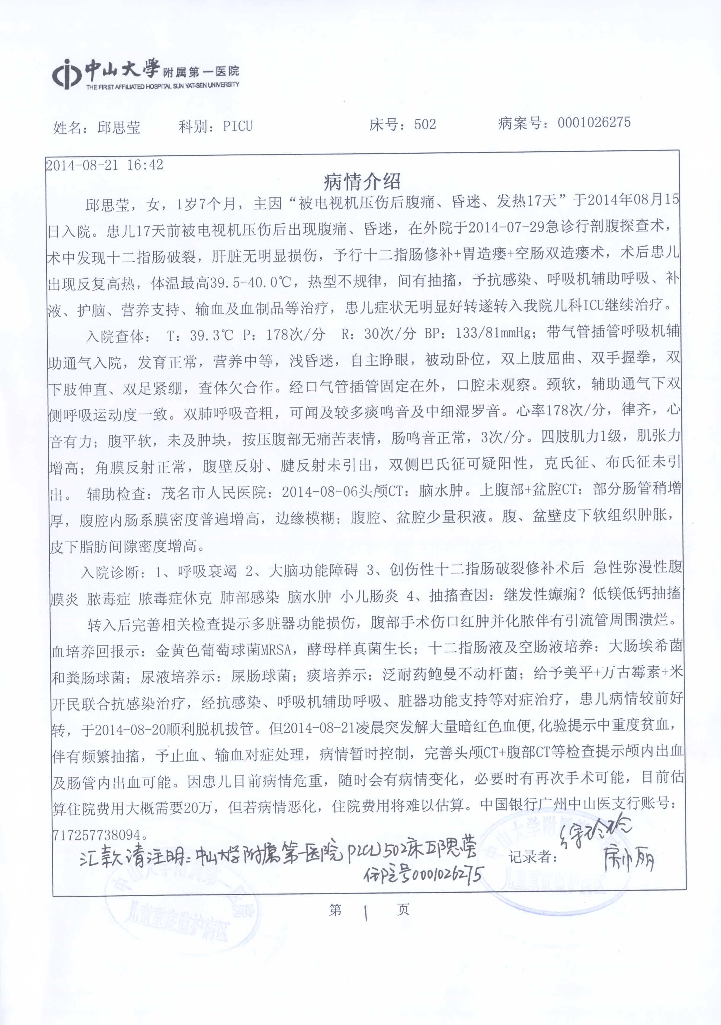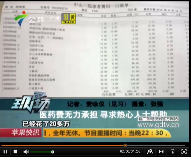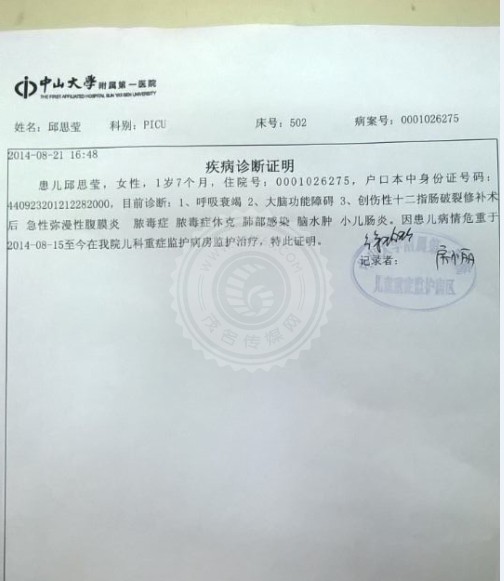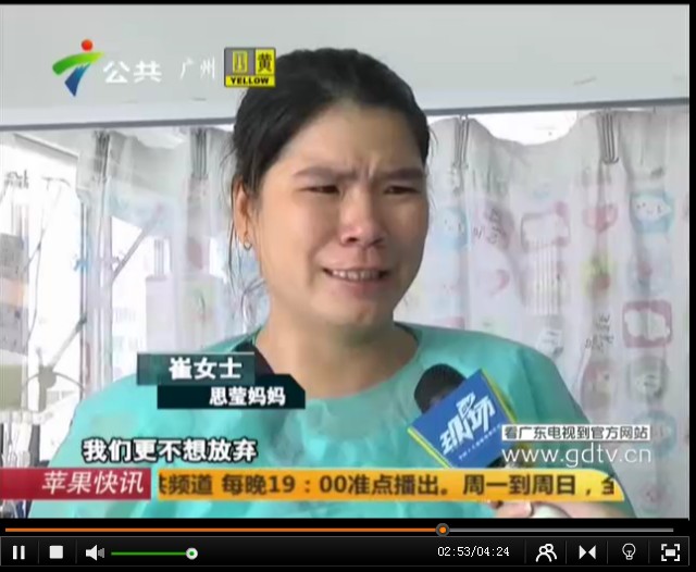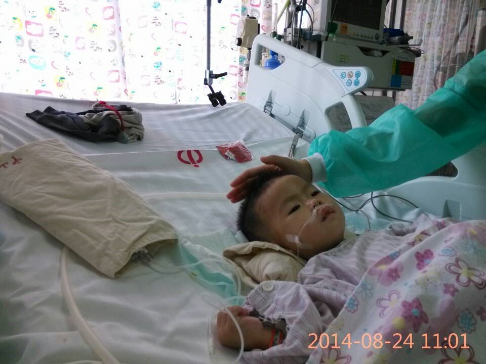 [FONT=黑体]邱思莹,1岁7个月,正是一个最爱跑动、攀爬的年龄段, 2014年7月29日,小思莹与3岁的哥哥一起攀爬玩耍时发生了意外,家里的老式电视机从桌子上掉了下来,正好砸在她身上,造成重伤。在茂名市人民医院被诊断为十二指肠破裂,急性弥漫性腹膜炎,感染性休克,肝挫裂伤,急性应激性溃并出血,多器官功能障碍综合症,在外科重症监护室(SICU)中经过半个多月的治疗后因该院无法继续治疗,与8月15日转入了中山大学附属第一医院,在该院的PICU中深切治疗部己十天,每天1万~3万元的治疗费使这个农民家庭陷入绝望中, 这期间都是向别人借钱治病,早已负债累累,也没办法继续借钱。尽管还未脱离危险,但是病情已经有所好转,医生说康复的机会很大,一定要坚持。家里人听到这个消息既高兴又担心,在这大半个月的急救治疗中已经用完了家中所有的积蓄,尽管如此,我们从来没有放弃救治小思莹的任何一个机会,然而接下来的治疗费用初步估计还要20万甚至更多,希望各界善心人士能踊跃献出爱心,让小思莹的生命可以得以延续,电视频道 > 公共频道 > DV现场http://v.gdtv.cn/html/ItemId68/2014-09-01/176179.html
