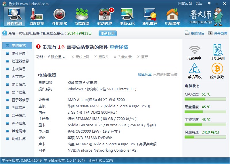 操作系统 Windows 7 旗舰版 32位 SP1 ( DirectX 11 )