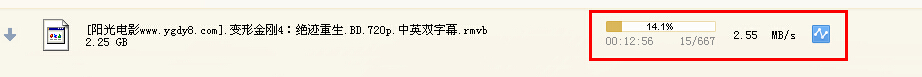 我随便百度一下搜了一部“变形金刚”BD 720P超清2.25G大电影下载测速,显示时间约14分钟下载完,以2.55M/S速度下载。