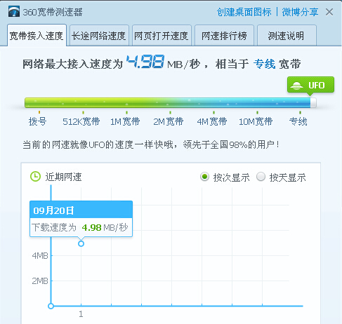 为了进一步验证网速质量,我使用非官方指定测速工具,用360宽带测速器测速依然达标。