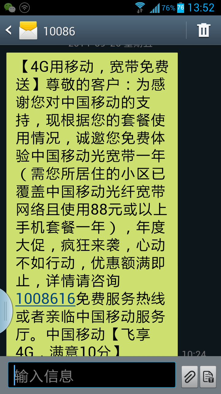 3、名额有限,必须提前预定活动参与资格再办理才能享受宽带报装或续费双重优惠。预定活动参与资格方法:编辑短信15016656386发送至106582223366登记。(收到系统回复说登记成功才算登记成功)