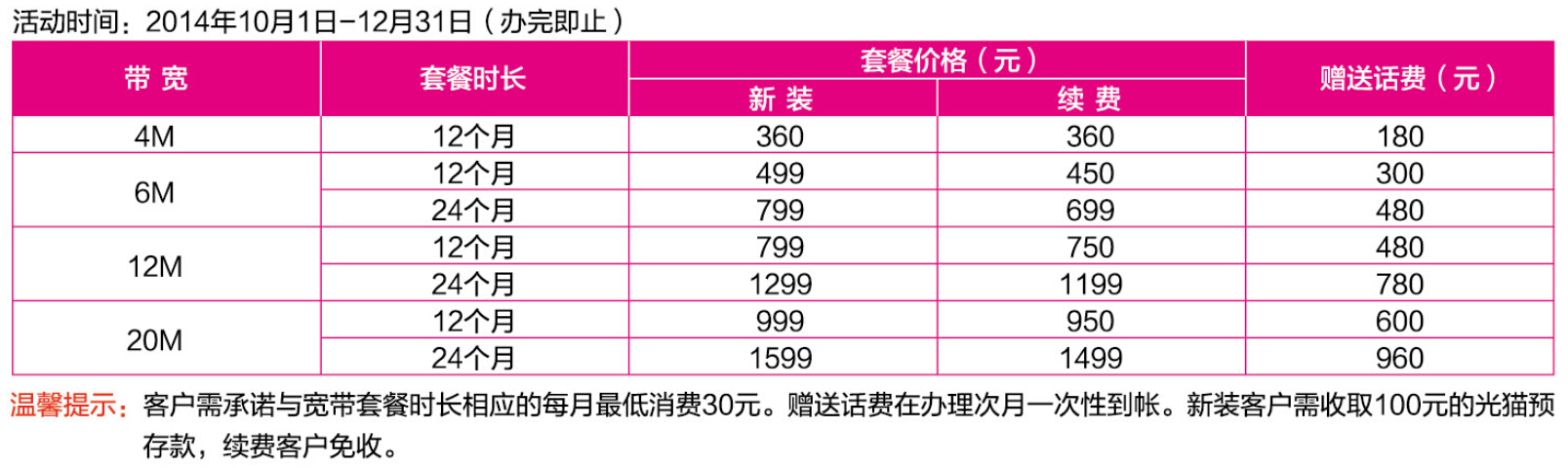 中国移动4G快人一步 初中一年级 注册 2014-09-20 消息 404 反馈评分 0 点数 1 2014-11-12 #212 中国移动光宽带双重优惠活动,宽带新报装/宽带续费,双重活动惊喜到你不敢相信!!! 活动内容及参与对象: 第一档:4M只需360元/年,送180元话费+加赠1年光宽带免费使用。续费360元 第二档:6M只需499元/年,送300元话费+加赠送1年光宽带免费使用。续费450元 第三档:12M只需799元/年,送480元话费+加赠送1年光宽带免费使用。续费750元 第四档:20M只需999元/年,送600元话费+加赠送1年光宽带免费使用。续费950元 2、新报装或者即将到期(相差三四个月才到期)的用户,均可享受优惠活动。 (报装/续费和了解咨询电话:13432333386、15016656386 陈经理)