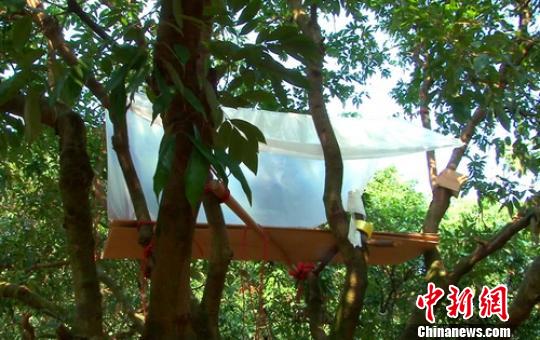 案发后,吴某龙曾窜到偏僻的荔枝林深处躲藏,在一棵荔枝树上用纸箱、木板、塑料布搭建了一个四面透风的窝棚。(梁盛 陈汉彬)