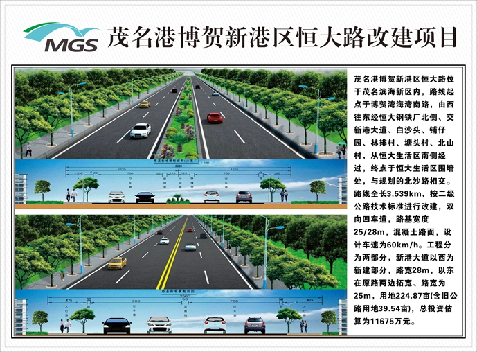 恒大路位于茂名港博贺新港区内,起点位于钢铁厂门口,终点位于生活厂区门前,全长2.16Km,根据恒大路工程改造计划,结合广东省公路建设的成功经验,届时,恒大改造项目将按具集散功能二级公路技术标准设计,设计速度为60Km/h,双向四车道,路基宽度25m和28m,并兼有城市道路工程,两侧设置人行道。