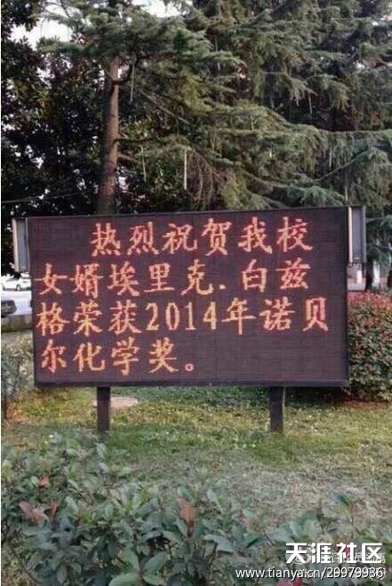 新京报10月15日报道 美国科学家埃里克?白兹格10月8日获得诺贝尔化学奖,其妻子吉娜毕业于安徽蚌埠一中。今晨,评论员杨禹在微博上发布的一张关于蚌埠一中祝贺本校“女婿”获诺贝尔奖的图片引发关注。不少网友戏称该校“攀亲戚”,认为埃里克获奖跟蚌埠一中没有关系。对此,校方回应称,挂出这则祝福是因为高兴,学校不会撤下这则祝福。 转自天涯社区。