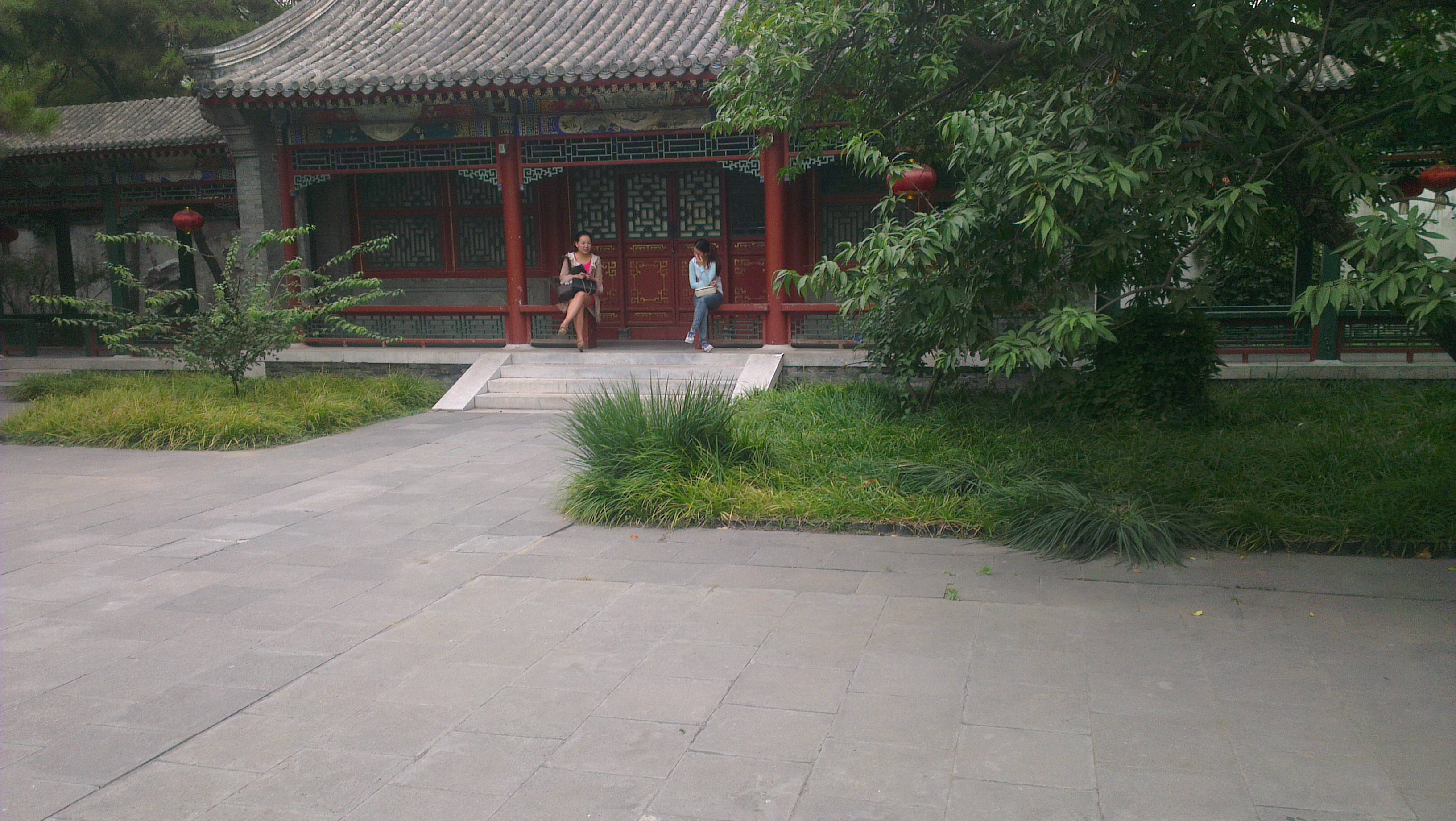 图为怡红院后门,游人不多,显得有点冷清,两个走累的游客坐着闲聊,也许她们在等候宝玉哥哥回来!