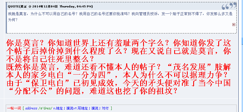 初悟人生 大学三年级 注册 2010-07-13 消息 858 反馈评分 0 点数 0 2014-12-05 #44 QUOTE(湖海山人 @ 2014年12月04日 Thursday, 09:06 PM) 我没孔婆的气量. 本来我计划在十周年后湖海山人这个ID就淡出论坛的。 [snapback]3720004[/snapback] 这句话说明什么问题?说明自己的丑陋的灵魂还是心怀坦荡?相信除了反映个人妒忌与复仇的心理外,再也难以有其他的用途了。 [attachmentid=335408] 附件 莫言的无耻.jpg 40.6 KB · 查看: 286