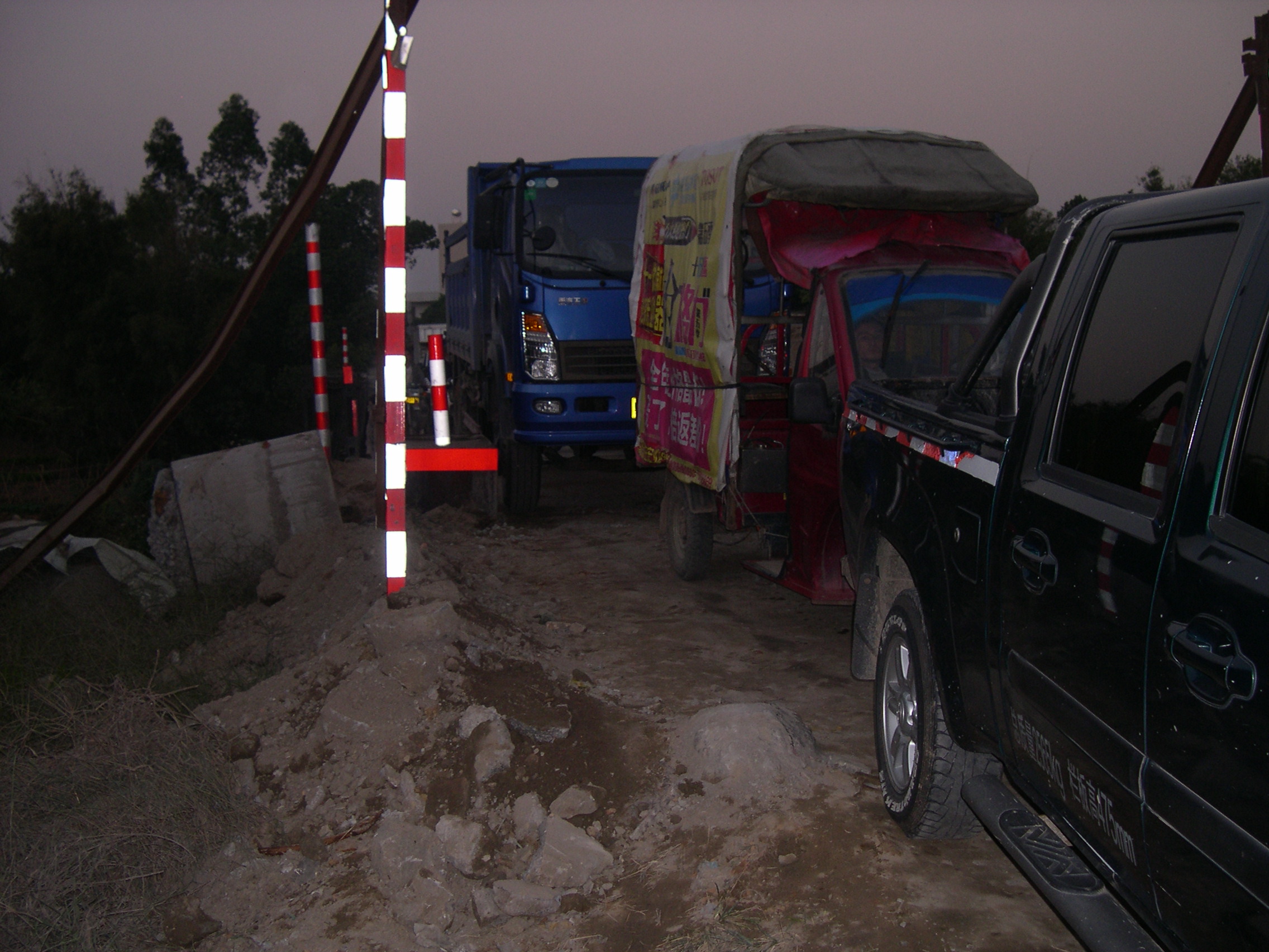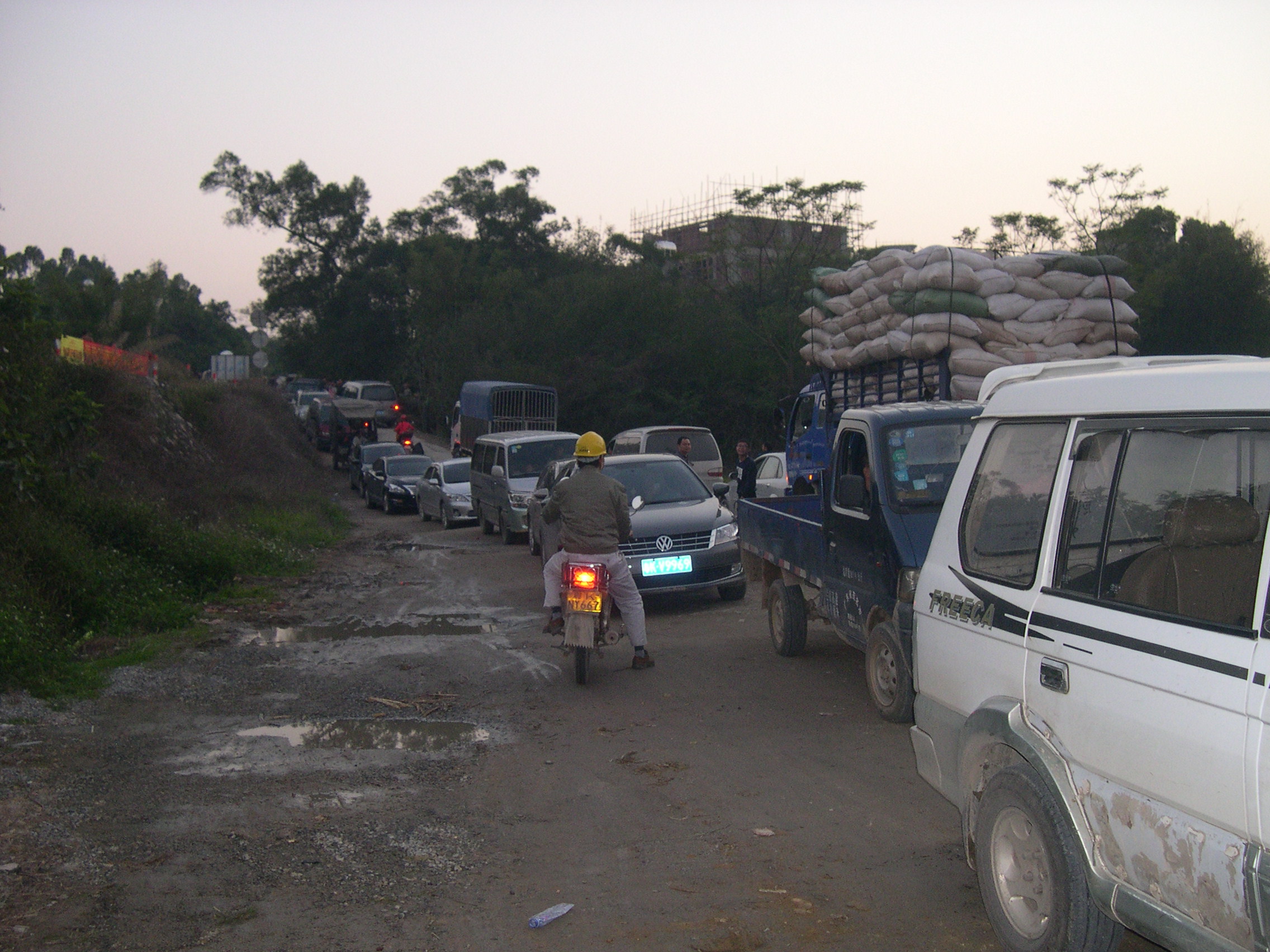 堵在合水口河两岸等候过桥的大小车辆排着长龙