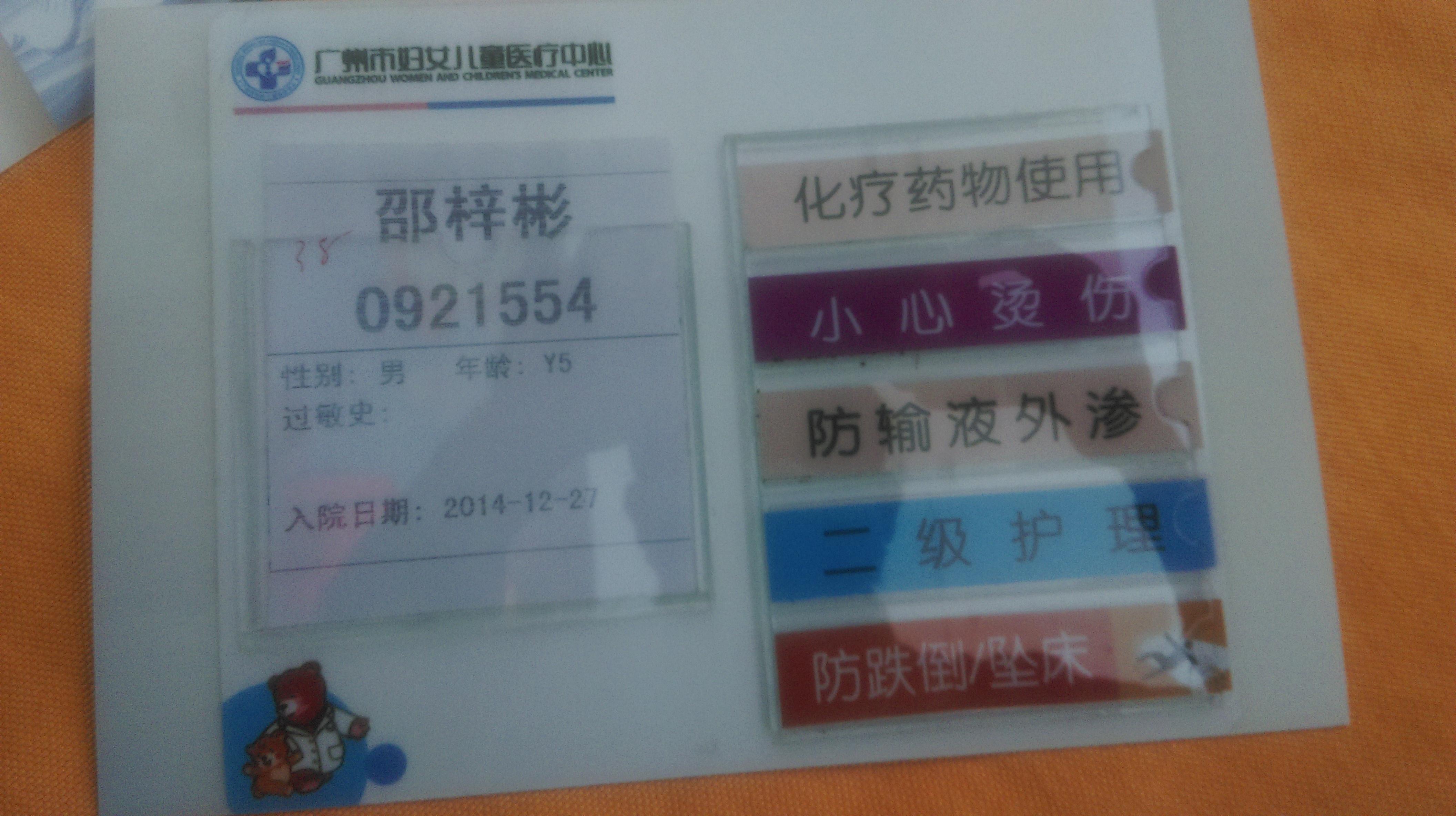 小男孩现在广州妇女儿童医疗中心珠江新城院区治疗,治疗要12个疗程,2014年12