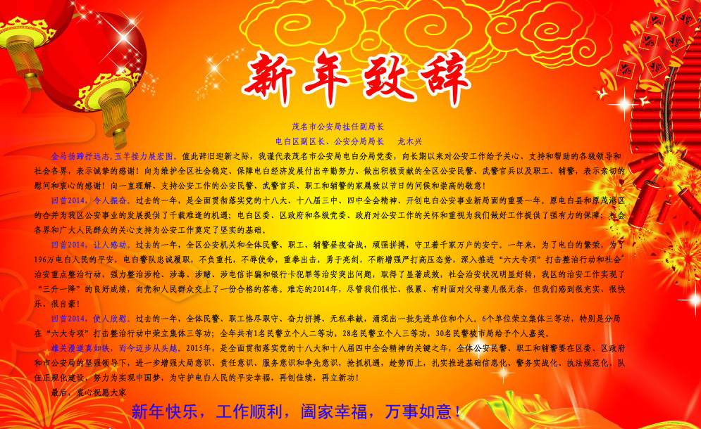 金马扬蹄抒远志,玉羊接力展宏图。值此辞旧迎新之际,我谨代表茂名市公安局电白分局党委,向长期以来对公安工作给予关心、支持和帮助的各级领导和社会各界,表示诚挚的感谢!向为维护全区社会稳定、保障电白经济发展付出辛勤努力、做出积极贡献的全区公安民警、武警官兵以及职工、辅警,表示亲切的慰问和衷心的感谢!向一直理解、支持公安工作的公安民警、武警官兵、职工和辅警的家属致以节日的问候和崇高的敬意!