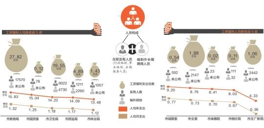 要提醒大家的是,市直部门的人员工资福利支出并不代表公务员的收入。因为据市财政局有关人士表示,部门的人员构成上有在职实有人员(行政编制、事业编制、后勤服务人员)和编制外长期聘用人员两类型。这意味着,工资福利支出包含了该部门对在职和编外所有人员发放的工资、补贴、社保等支出。