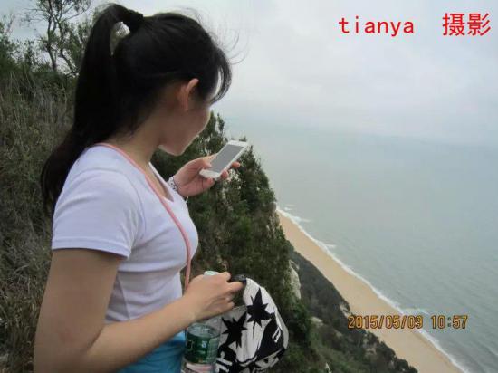 呢个靓姐在晏镜岭最险峻的地方聚精会神地看手机信息,脚下是大海。