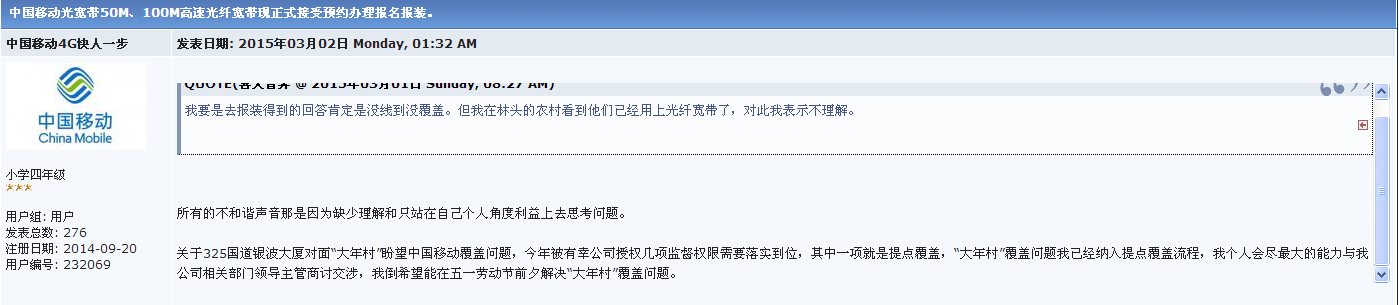 G gjh 高中一年级 注册 2009-08-18 消息 593 反馈评分 63 点数 11 2015-05-18 #20 QUOTE(中国移动4G快人一步 @ 2015年05月16日 Saturday, 10:45 PM) 今天遇到一个续费客户,交了钱办了手续,竟然怀疑在我这里办理的宽带跟在营业厅办理的不一样,真是可笑之极,真替这位客户感到无知无语。 [snapback]3751848[/snapback] 连最起码的礼貌都没有,是代表移动在发言吗?