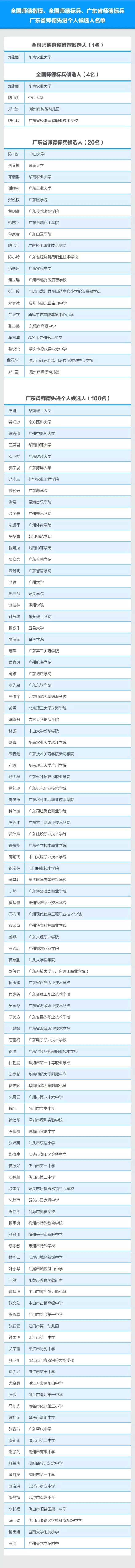 2015年全国师德楷模、全国师德标兵、广东省师德标兵、广东省师德先进个人候选人公示名单今天新鲜出炉了~!根据《关于评选广东省师德标兵和师德先进个人的通知 》(粤教工〔2015〕11号)精神,经各市、各单位推荐,由省教科文卫工会和省教育厅相关部门组织的评审委员会认真评选,共拟推荐陈敏等20名同志为广东省师德标兵候选人和李琳等100名同志为广东省师德先进个人候选人,拟推荐邓诣群等4名同志为全国师德标兵候选人,拟推荐邓诣群同志为全国师德楷模候选人,公示期为5天。我们为这120名来自不同学校不同岗位默默为学生奉献的老师们,手动点赞