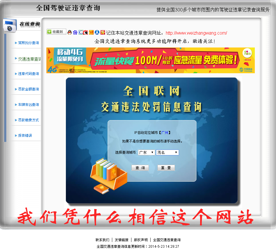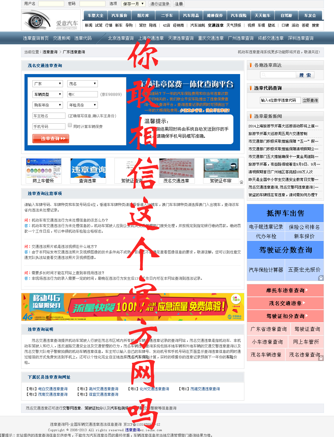 对“茂名市交通违章查询”网站怀疑是假的?为什么?百度一下,好像没有“茂名车管所”的官方网,在百度所查到的都是“野鸡“网站。这些网站,没有经过国家信息管理局备案。还有域名也不像是官方网,如:http://www.weizhang8.cn/guangdong/maoming.htm