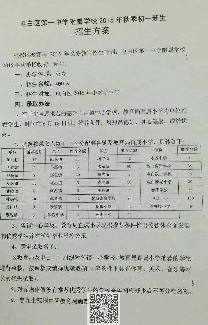 电白区教育局倾向民办学校,单看这一张招生计划表分布情况就明白了。民校有春华53名,杨梅寄宿23名+杨梅56名,育贤38名(模糊不清),汉山14名。其它边远一个镇凭什么比一所民校少。民校是亲生子,其它边远镇是私生子,或者,难道民校进贡一名学生教育局收一份提成不成?要求教育公平公正公开竞争。