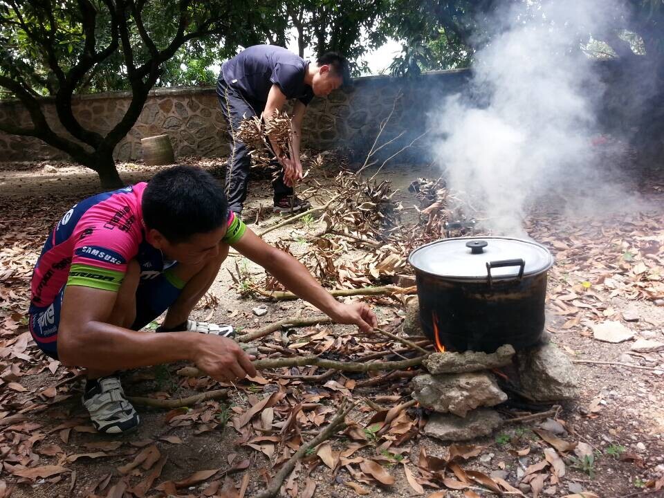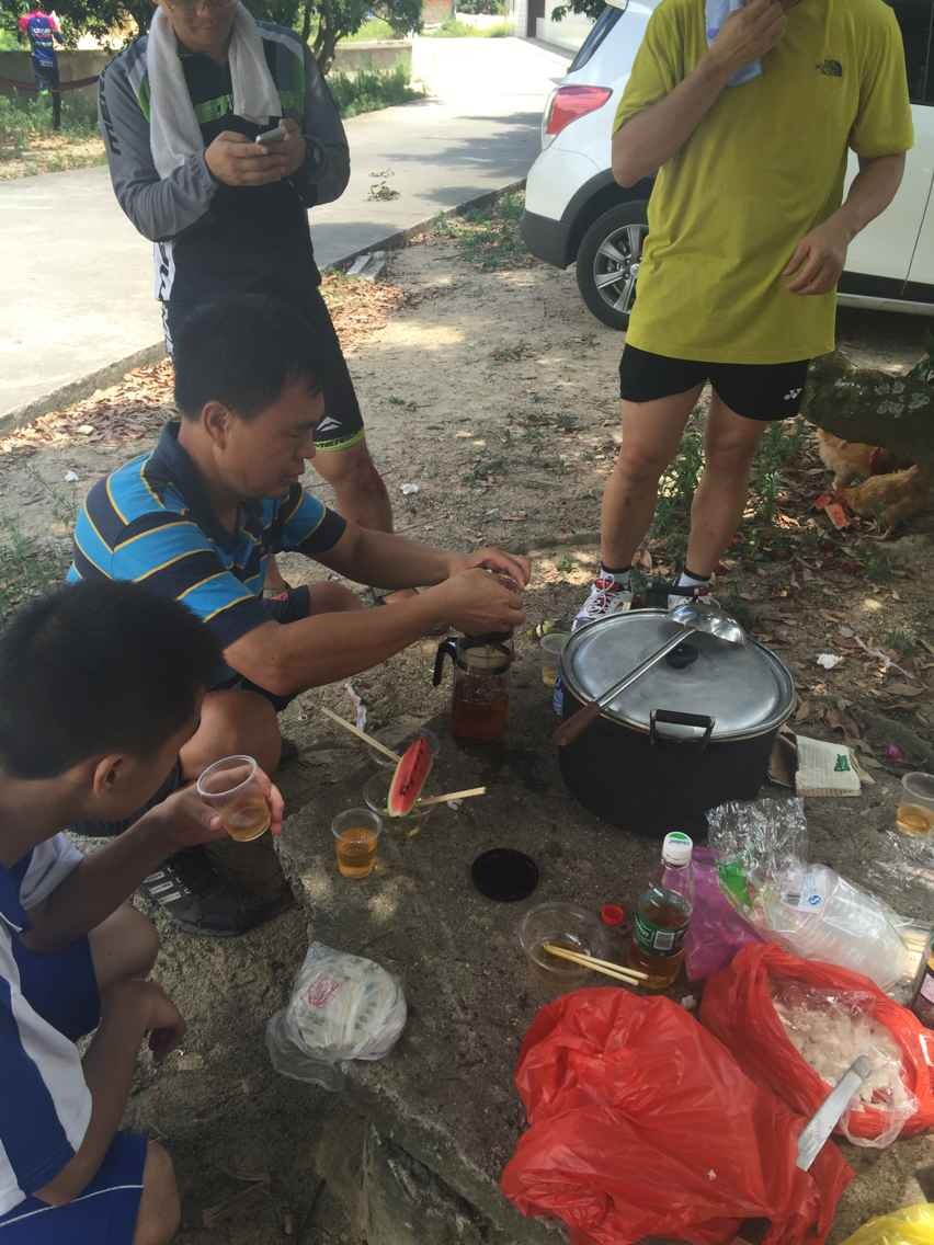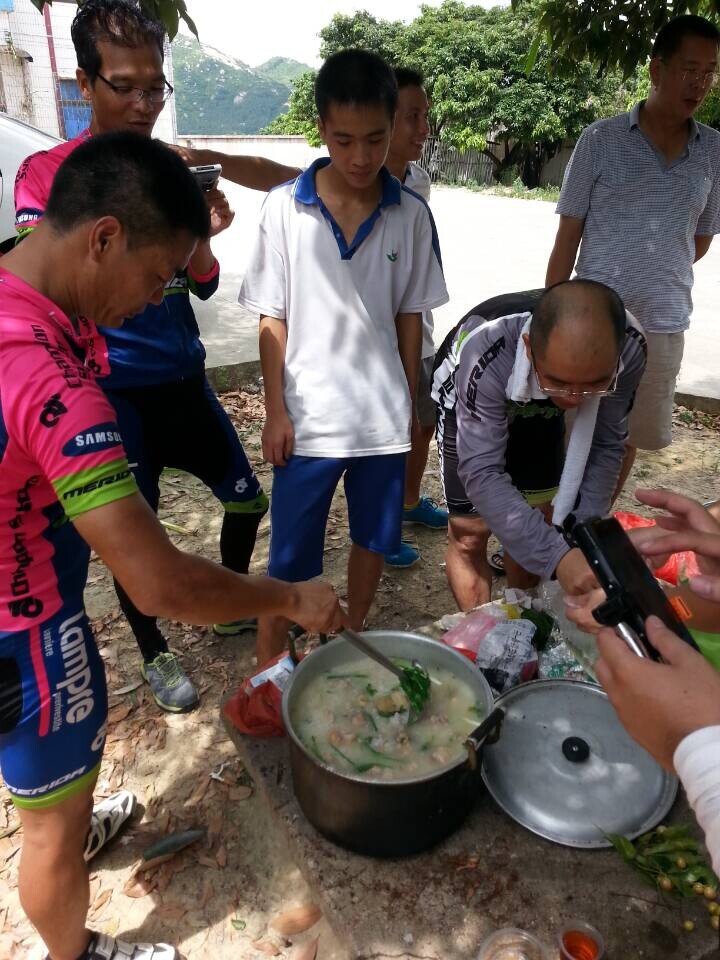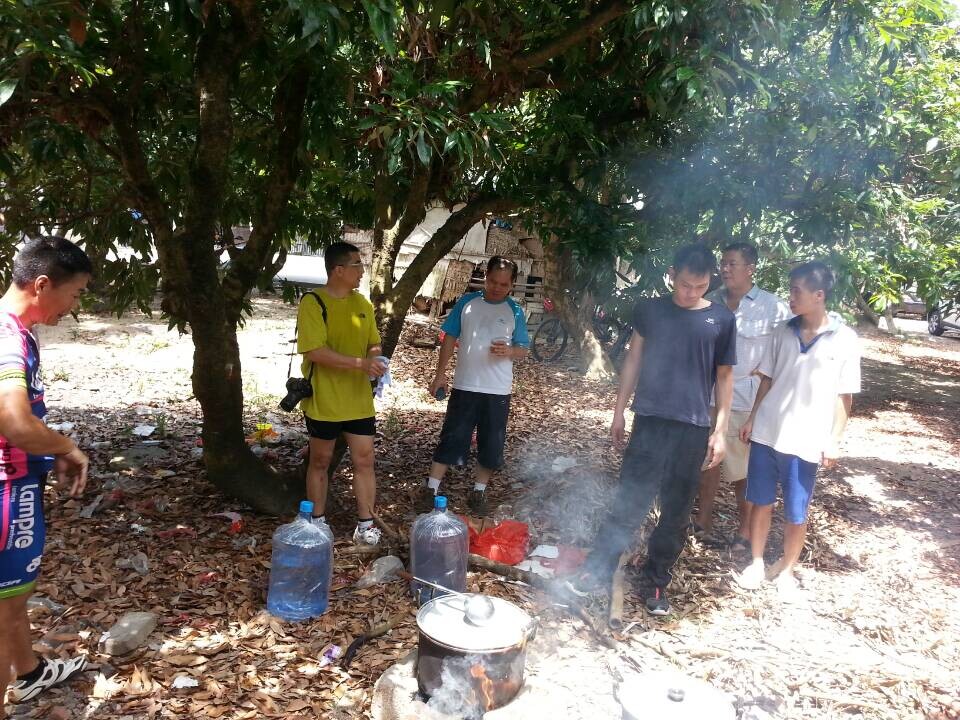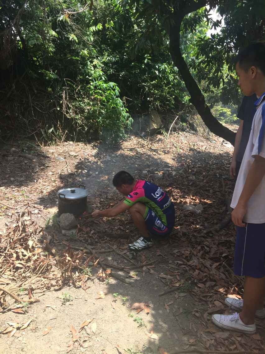 骑行一直在美滋美味的过程中进行,我们骑经河湾水库和秀田水库之后,十一点到达今天的目的地热水水库。这时从树仔出发的彬哥等3人,已经带着两个铁锅早早到位了,接着大家二话不说分工合作,烧水煮茶品味人生其乐无穷。此时后勤部队也及时赶来,带着今天的野炊主菜鸡、瘦肉、粉皮和米等,一场热火朝天的茗茶煮粥论英雄诗篇渐渐拉开。