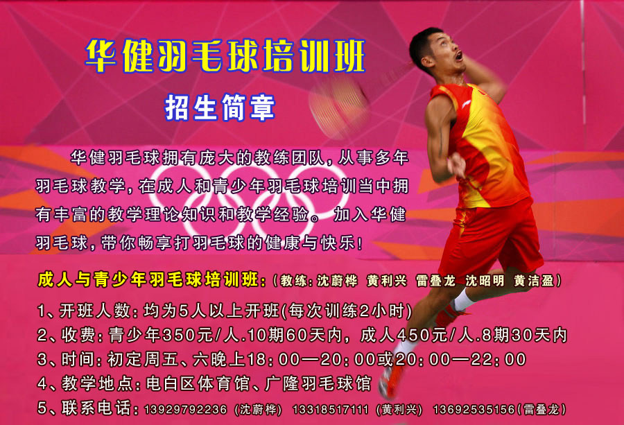 H hlxgddb 学前班 注册 2007-07-09 消息 35 反馈评分 0 点数 0 2015-06-29 #1 电白华健羽毛球培训班开始啦! 开设有青少年班和成人班以及暑期班和长期班。 学打羽毛球从华健羽毛球开始! 电白华健羽毛球与您一起快乐健康成长! 附件 2015-06-25 20.05.10.jpg 70.2 KB · 查看: 152 华健培训宣传单张70张.jpg 196.4 KB · 查看: 241